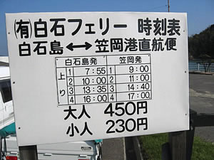 笠岡のいくつもある小さなフェリー乗り場に着いたのは16時50分。三洋汽船の係員に白石島に行きたいことを告げると、最終便が17時に出るとのこと。「乗り場が違うけど、急いで行けば間に合うかもよ」と、ノンビリした口調で「急げ!」の忠告。出航ギリギリのフェリーに飛び乗った。