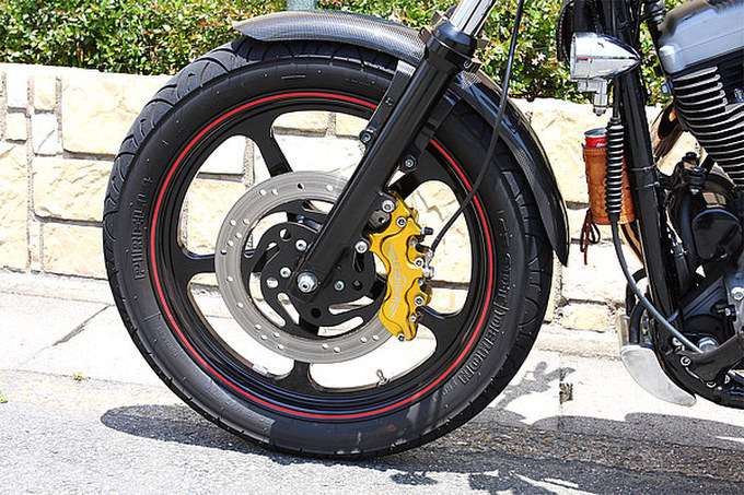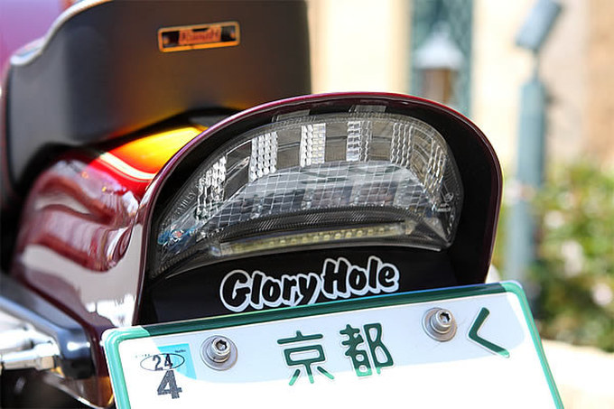 新車で購入した当初は、前後ローダウンとフルペイントといったスタンダードなカスタムを施していたが、あるときを境にレーシーなスタイルへの移行を決め、今の姿となっている。左右2本出しとなる小野商会製エギゾースト「サイドワインダー」をグローリーホールがアレンジして装着、さらにドイツのBERINGER(ベルリンガー)製キャリパーに前後ホイールをミスミエンジニアリング製5スターホイールに交換。ほかにカーボンで巻いたステンレス製ハンドルバーやオーリンズ製リザーバー付リアショックアブソーバと、オーナー自身も「もうやり尽くしました」というほどのカスタムだ。