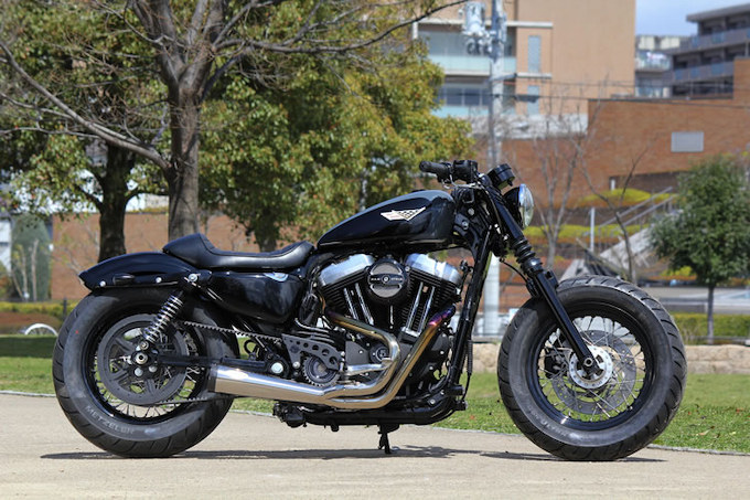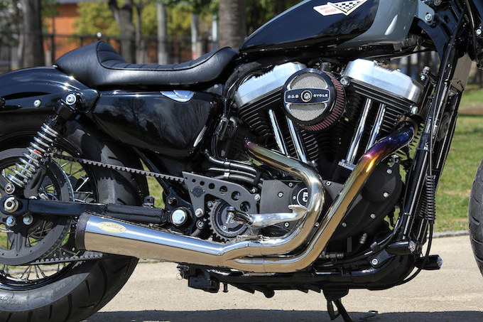タイトなポジションを演出するグリーミングワークスのドラッグバーにソロシート&ショートリブフェンダーの組み合わせによりフォーティーエイトらしさを強調。さらにワンオフ製作されたフューエルタンクが取り付けられ洗練されたイメージに仕上げられている。マフラーはストックから約10キロの軽量化を実現するグリーミングワークスのチタニウム バリトンマフラー 2in1を装着。迫力のリアビューはもちろんのこと、乾いた重低音のサウンドも大きな魅力となっている。まさに乗ってよし、眺めてよしのマシンにフィニッシュ!