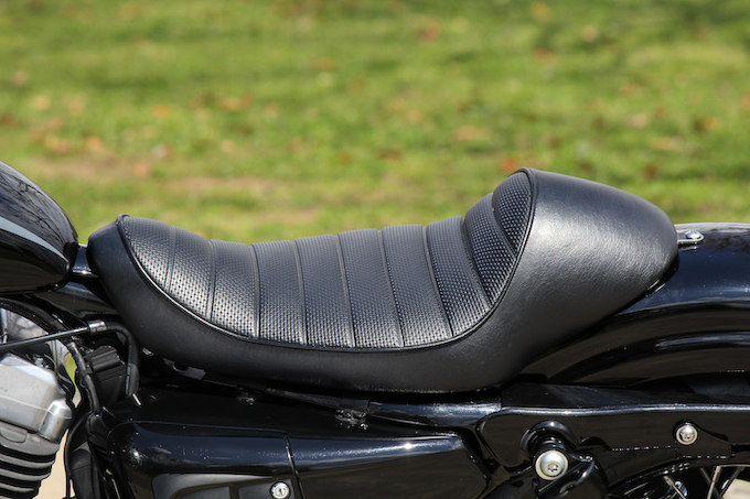 英車のカフェレーサーのようなオリジナルシート。その機能、デザイン性も文句なしの出来。