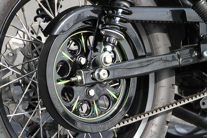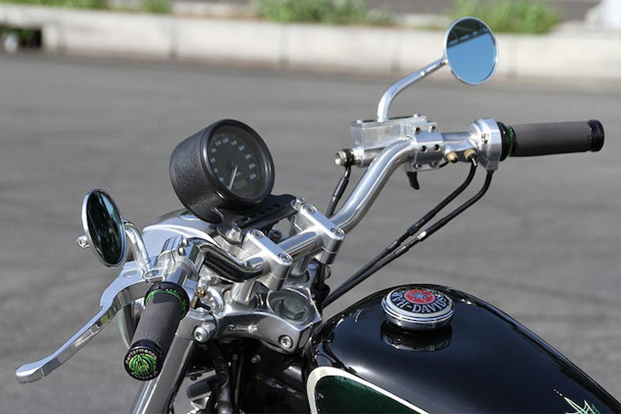 ピーナッツタンクにそら豆シート、F19/R18インチのスポークホイール、そこに左出しの一国オリジナルエキゾーストやグリーン×ブラックを意識したグラフィックと、古き良き時代のスポーツスターの姿を見事に再現。ハーレーへの造詣の深さを感じずにはいられない完成度である。