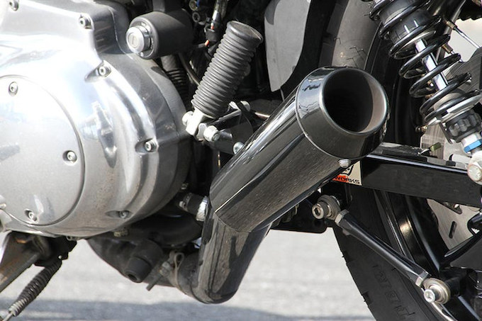 一国が着手するからには、ライディングパフォーマンスをおろそかにするわけがない。フロントブレーキはシングル仕様ながらブレンボ製キャリパー & ディスクを換装、リアも同様とされる。リアショックにはオーリンズS36Eがおごられ、フロントスプリングもストリート仕様になっている。