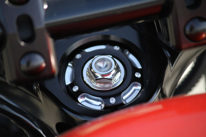ノーマルのステムボルトに色気を与えるビレットパーツ。さりげなくもコックピットの雰囲気を盛り上げる。