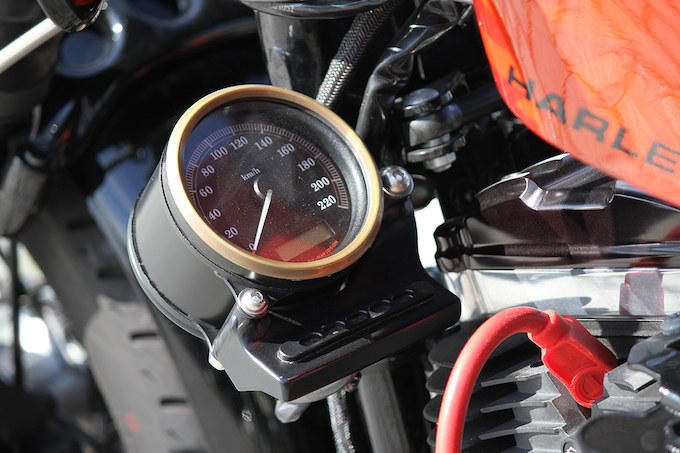 ノーマルのメーターをそのまま活用できるボルトオンパーツ。ブラス製リングで黒いボディにアクセントを与えた。