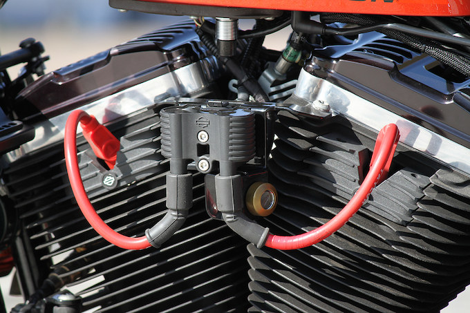 タンク下に集約されるイグニッションを移設し、配線類も移動させてシリンダーヘッドの上をスッキリと見せる。
