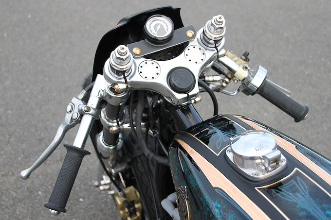このカフェレーサーがお披露目されたのは、2015年12月に開催された『ヨコハマホットロッドカスタムショー』だ。昨今のカスタムシーンを見ている人なら、このバイクを一目見ただけでチェリーズカンパニーのスタイルを連想することだろう。しかしよくよく見てみると、ボディワークこそチェリーズのそれながら、グラフィックや各ディテールのパーツに異なるテイストが盛り込まれていることに気づく。