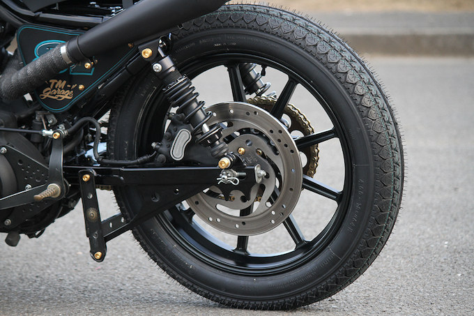 「ダークなイメージのマシンに対して、ポリッシュのエンジンが浮いていた」と、なんとフレームに載せたままブラックに塗装したという。TMガレージの技術の高さが垣間見える。