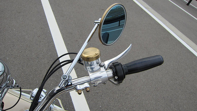 カスタムはクラシカルな純正スタイルを崩すことなく各部に手が加えられている。まずはスプリンガーフォークの泣き所であるブレーキをPM製に交換し、足付きをよくするためサドルシートが取り付けられている。さらにハンドル、レバー、ウインカー、サイレンサーを交換し、FCRキャブでパフォーマンスアップ。今後はハイカム化やオーリンズのリアショックを取り付け、さらなる走行性能の向上を目論んでおられるご様子だ。