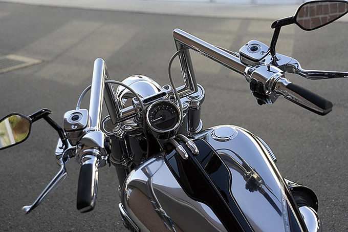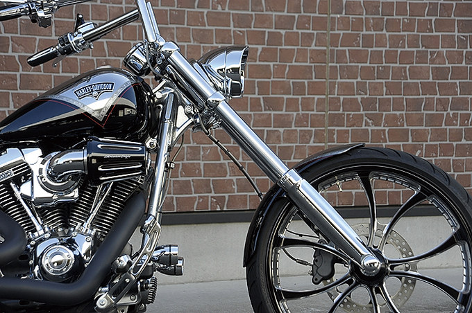 レオチンさんの乗るブレイクアウトは2013年モデル。メーカー純正カスタムの中でも飛びきり派手なブレイクアウトCVOをベースに、ロングフォークを装着。さらにゴージャスな現代版のチョッパーを製作してしまった。