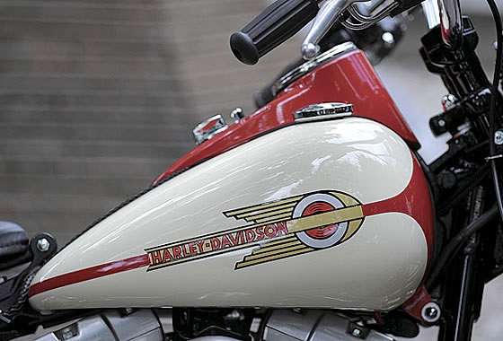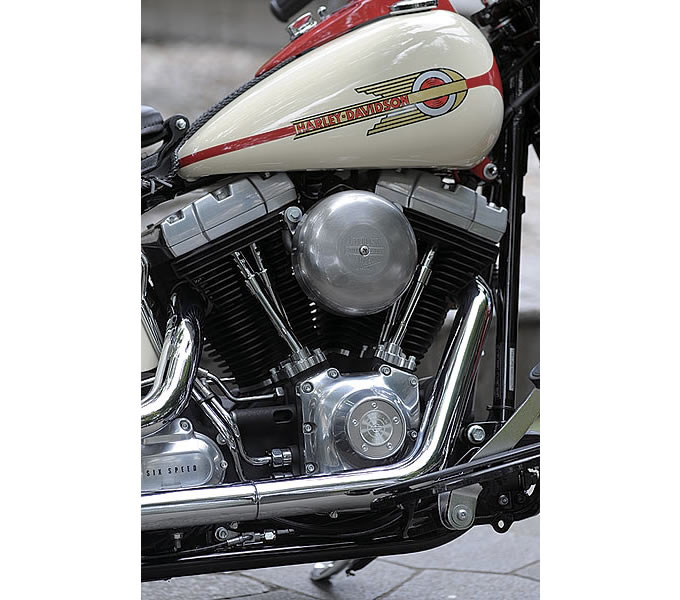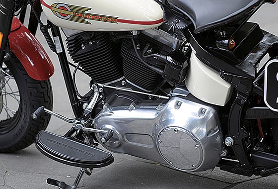 クラシカルなハーレーをよりいっそう際立たせるアイテムとして欠かせないのが、スプリンガーフォークの存在だ。元々は初期のパンヘッド以前に採用されていた本物のヴィンテージアイテムだが、エヴォ以降に最新のテクノロジーで復活して、さまざまなモデルに正式採用されてきた。その最後のモデルがこの FLSTSB クロスボーンズ。現在のラインナップにはすでにスプリンガーフォークの装着モデルは存在しない。ただでさえクラシカルなフォルムのクロスボーンズを、さらにヴィンテージへと近付けたカスタムを施したモデル。それがこのハーレーダビッドソン新宿が作り上げたコンプリートカスタムである。
