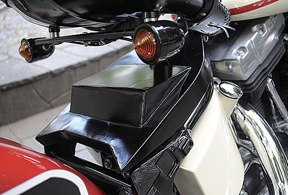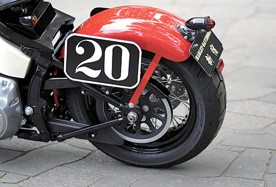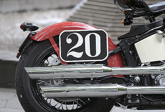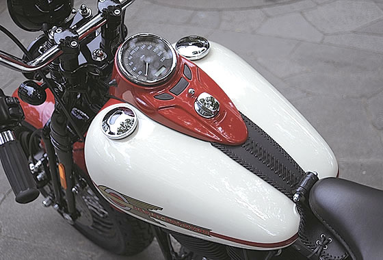 目指したスタイルは、無論ヴィンテージボバー。ゼッケンプレートまで装着されているが、こちらはもちろんシャレで、取り外しは簡単に行えるものだ。骨格はほとんど手を付けず、ローダウン化もされていない。しかしフォルムが低く見えるのは、スイングアームに溶接されたリアフェンダーと、クラシカルなサドルシートが作り出す独特のムードからであろう。メッキ部分を極力排し、ソリッドな色合いのツートンカラーに塗装された外観も独特の雰囲気を演出している。