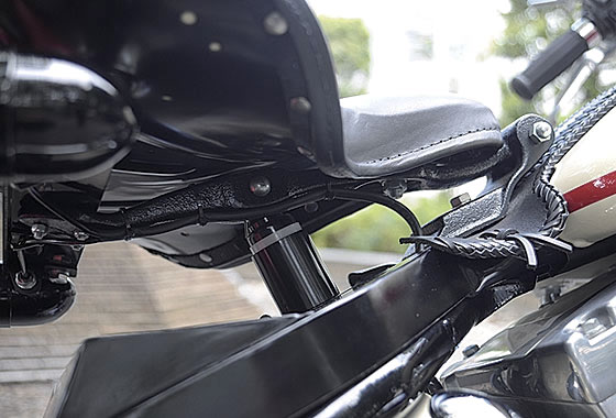 シートを取り払ったフレームの内側にはワンオフでスチール製のカバーが取り付けられ、サドルシートならではのシルエットを効果的にしている。徹底的にクラシカルなシルエットに細部までこだわった内容なのだ。