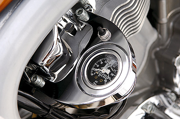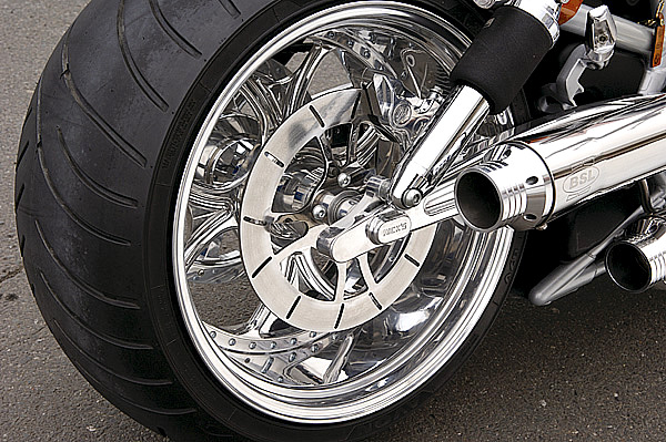 ストックのスタイリングを崩すことなく、ビレットパーツの質感と攻撃的なまでのペイントワークが調和したこのV-RODカスタムにいざ試乗。ハンドルバーはちょうど両手を広げた幅に設置、ステップはミッドコントロールとされる。街中を走れば注目の的。迫力のリアエンドはユーロばかりか、今やワールドスタンダードと言える。