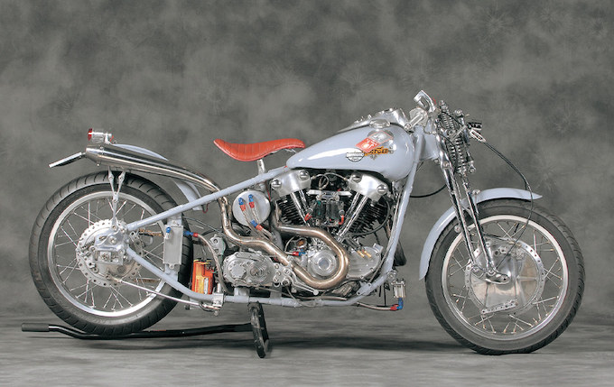 47ナックルをベースにノスタルジックレーサーへとモディファイされたこのマシン。チューンドナックルモーターは、ほとんどサイバーテックにてワンオフ製作。同店の高い技術が伺い知れるポイントだ。ノスタルジックでありながら機能は最新のモノへとアップデイト。多彩な工作機械を所有するサイバーテックならではのアプローチだと言えるだろう。オリジナルのスプリングフォークにマフラーの取り回しなど見所は尽きない。