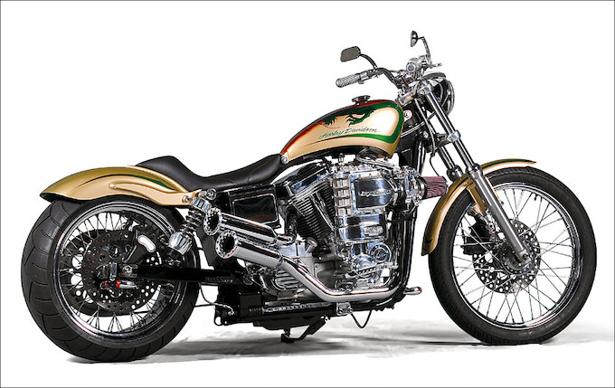 ケンズファクトリー製作の2003FXDカスタム。エンジンには美しくポリッシュされたスーパーチャージャーが取り付けられている。コンセプトはズバリ「ドラゴンボール」。シャンパンゴールドのフューエルタンクにはイメージソースのグリーンドラゴンがペイントされている。コンセプトに負けない驚愕の走りを実現するハイパフォーマンスカスタムである。その均整の取れたスタイリグもケンズならではのものだと言えるだろう。オーナー/GOTO