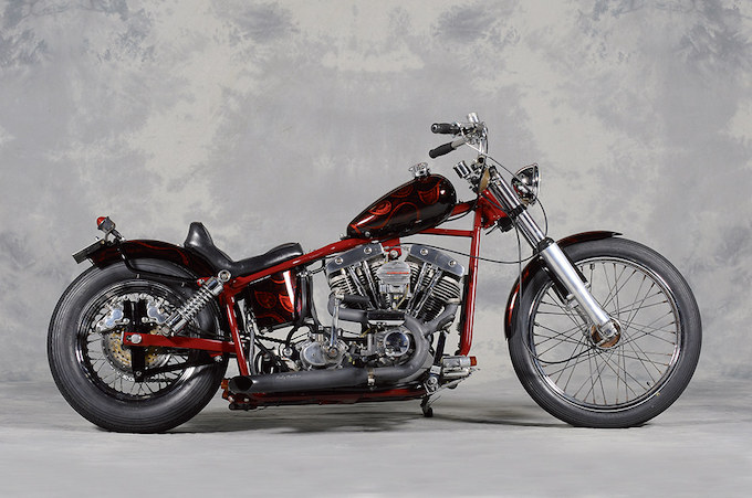 キャンディレッドに彩られたレアな1980年式 FLTベースのチョッパー。光の角度でグラフィックが浮かび上がり、夜の街灯での雰囲気が最も個性的だという。まさにペイント工房ならではのこだわりが凝縮されいてる。純正4速フレームにマスタングタンク、フラットフェンダーという定番のセッティングであるが、完成度は高い。オーナー/波多野 聡