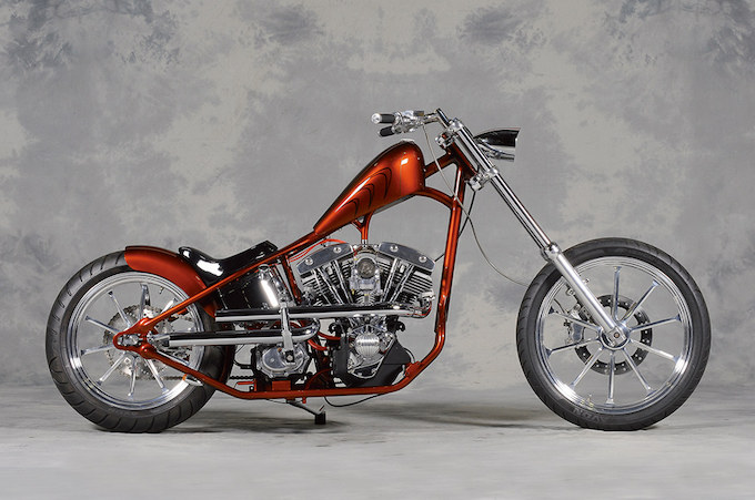 この均整の取れたシルエットを堪能して頂きたい! これぞプロの仕事と呼ぶべきカスタムであろう。ルックスと走行性が高次元で両立することを証明する81FXS。ワンオフ製作されたシングルクレードルのストレッチフレームがこのカスタムの要となっている。キャンディブラウンのカラーリングがなんともシックな印象のマシンである。オーナー/森本勝利