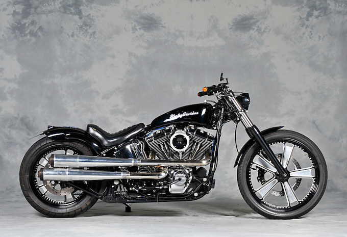 2000年式ソフテイルデュースをベースにハイパフォーマンスパーツで固められたVファクトリーによるマシン。「ロー&ロング」に加え「ブラック&クローム」をコンセプトに製作されている。ホットドック製サイドワインダーマフラーをワンオフのエキパイでセンターに配置。エクステリアのブラックとクロームモーターのコントラストも美しい。オーナー/鈴木憲一