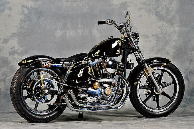 クライン・クリスチャン率いる京都のトロージャンサイクルが手掛けた1975年式XLHチョッパー。70年代の米国で製作されたカスタムバイクをレストア&アップデイトした車両である。エクステリアのペイントを筆頭に、要所のゴールドが効果的に配置され、どこかオリエンタルな雰囲気を漂よわせている。凝ったマフラー形状やフェンダーストラット、チェーンガードなどのディテイルも抜かりなく作り込まれている。ポジションは女性でも安心なコンパクトなもの。