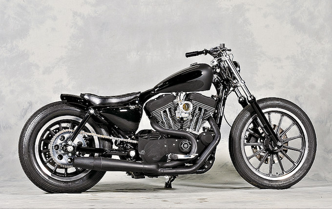 「ラバーマウントエンジンのスポーツスターをベースに、いかにコンパクトにまとめるか」というコンセプトで製作された2004年式のXL883R。サラッと見えるが多数のワンオフパーツで緻密に構成される力作。グロスブラックのベースにマットブラックでスキャロップがあしらわれたシックなカラーリングもいい雰囲気である。基本的にはお任せで製作したということもあり、ルードロッドらしい仕上がりとなっている。オーナー/植木