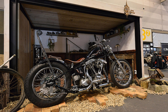 ガレージ風のブースにショベルチョッパーを展示したボディークリーナー。トータルで同店の世界観が演出されている。