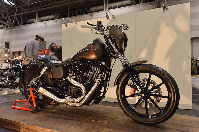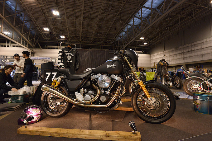 東京から参加したジョイライドが展示したFXRレーサー。前後のオーリンズサスとバックステップでロードクリアランスが確保されている。