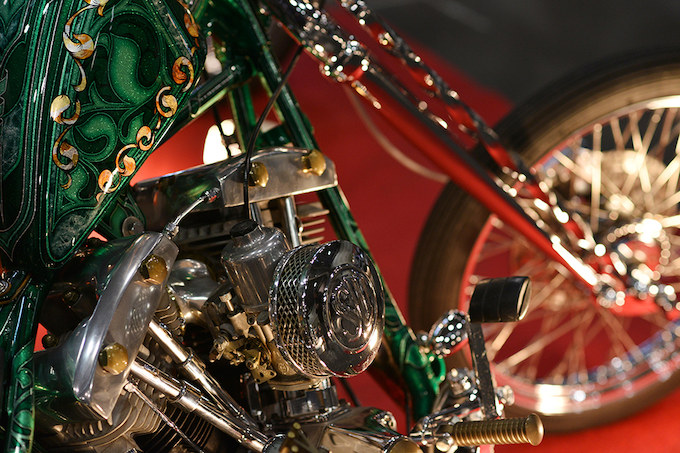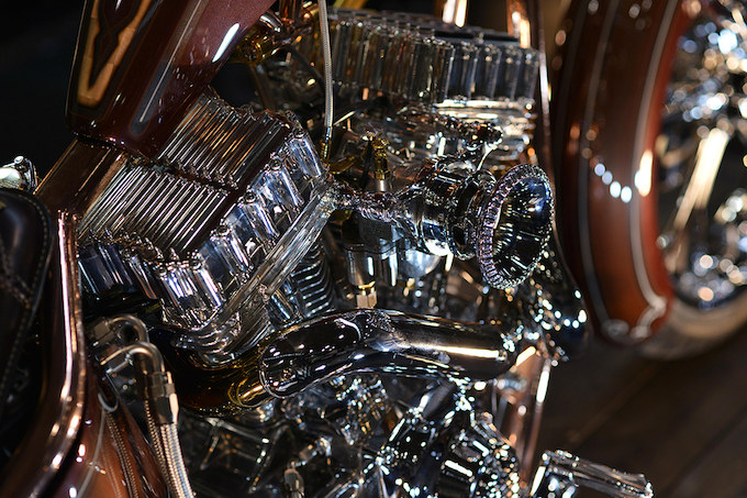 ライトに浮かび上がる磨き上げられたクロームパーツ。これぞショーマシンという輝きである。