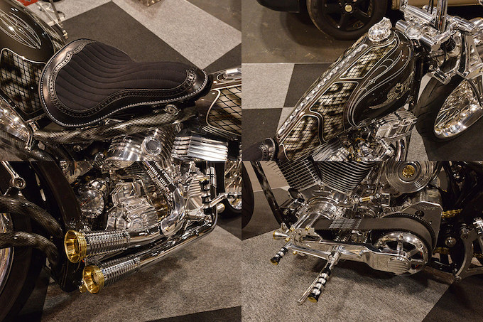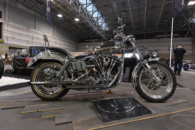 CYLAが展示したフルメッキのショベルヘッド。徹底的にクロームにこだわり無機質な独自の質感を醸し出す一台。