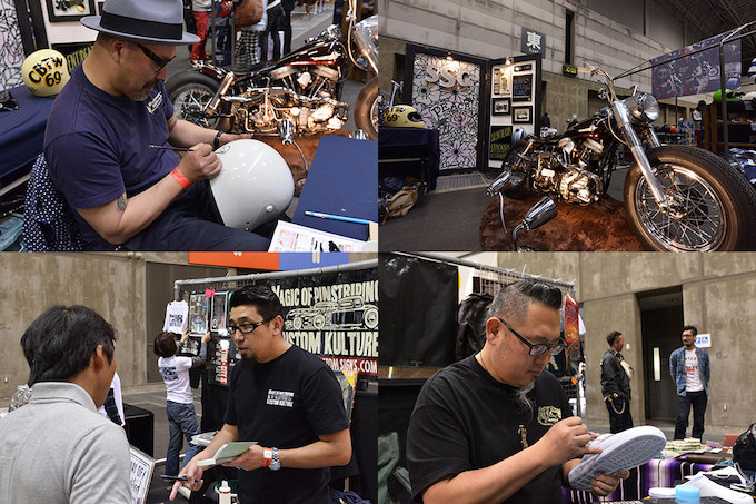 愛知県のカスタムペインター、センタールーツのブース。至極のカスタムペイントが施されたマシンは見応え充分。