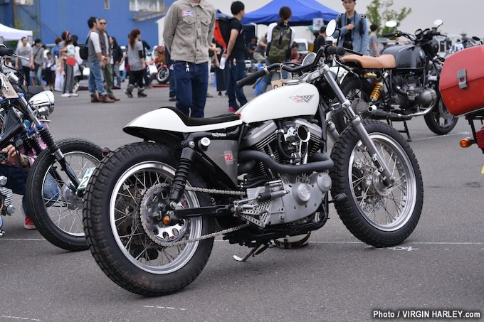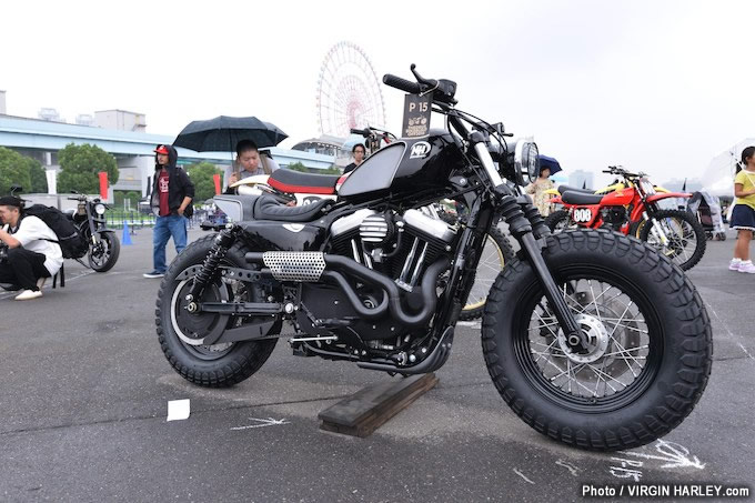 23NITRO HEADSのスポーツスターカスタム。アップマフラーにダートタイヤを装着したアクティブなマシンである。
