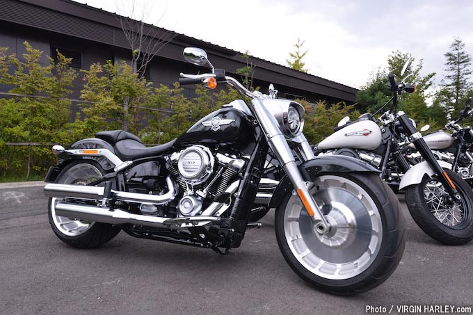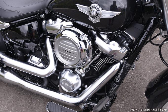 07バージンハーレー.comはファットボーイに試乗させて頂いた。エンジンはミルウォーキーエイト107(1745cc)を搭載したFLFBファットボーイ。