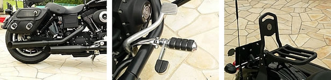女性には珍しくブラックアウトされたFXDX。エンジンなど最初からブラックだったところ以外もマフラー、リアサスペンション、エンジンガードなど各部は黒で統一されている。