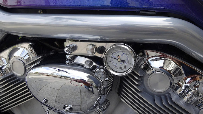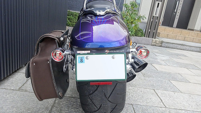 キーワードは「ジェントルなVロット」、かつオリジナリティーの追求だ。まずは足周り。なかなか「コレだ!」と思えるホイールが見つからなかったというが、雑誌で見かけたビッグマシーンの3Pホイールにインスピレーションを感じ購入を決意。前後18インチのホイールでリアタイヤにはワイドな260をインストール。リアショックにはエアーサスペンションが取り付けられている。ポイントはマフラーである。純正のスタイルがお気に入りだったため、100mmショート化、さらにサイレンサーをストレートに加工、かつ前後異径とし迫力を演出。非常にマニアックなモディファイが施されている。