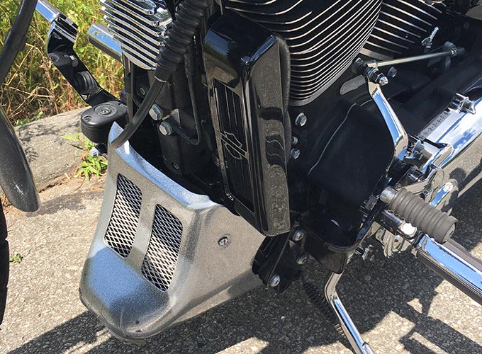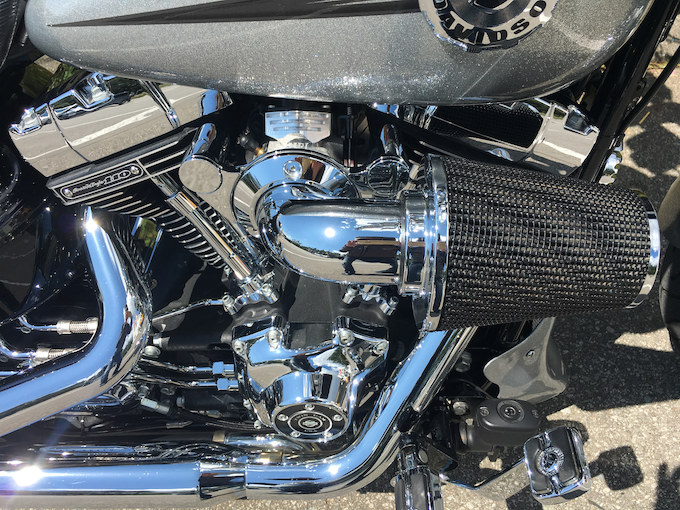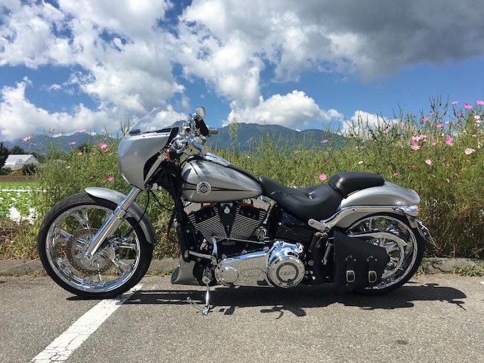 オリジナルが持つロー&ロングのスタイルをスポイルすることがないようカスタムに着手。まずはモアパワーを目指して純正スクリーミンイーグルの110ciコンバージョンキットをインストール。さらにS&S製カム、マフラーなどを装着し、理想の乗り味を入手。前後ハイパープロのサスペンション、PM製ホイール&ディスクで足周りも強化されている。その他、クロームパーツを多用し、ハーレーらしいゴージャスな雰囲気に仕上げられている。まさに死角なしの一台である。