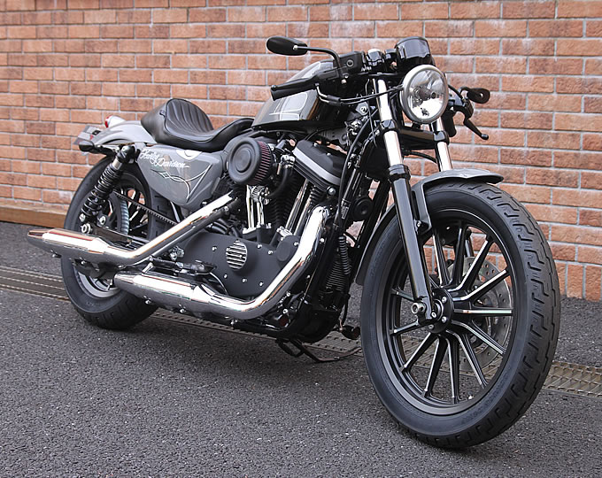 今回取り組むテーマはずばりカフェレーサースタイル。以前ハーレーカスタム紹介でもアップした 2010年式 XL883N iron のイメージを踏襲したもので、キモとなるのは ROLAND SANDS DESIGN製のゲージマウントとセパレートハンドルキット。いつの時代も必ず存在するカフェレーサーカスタムをスポーツスターに取り入れるアイディアはこれまでにもあったが、このほどアメリカから発信されたこのビレットパーツが芦田氏の目にとまり、煮詰めた結果とっておきの一台が完成。
