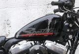 こうしてヒデモ定番のリア加工作業が完了しました。ここで改めてスタイリングを確認、保留としているタンク製作に再び着手です。リアエンドをまとめ、シートベースを載せて見てみると、タンクをもう少し扁平な感じにしても良さそうですので、次はまたまたタンクに手を入れていきます。FORTY-EIGHT らしさに固執してピーナッツタンクのイメージから離れられないと、フルカスタムという目的そのものを見失いかねませんから、ここは思い切って極小フューエルタンクへと変貌させてしまいましょう。