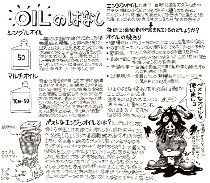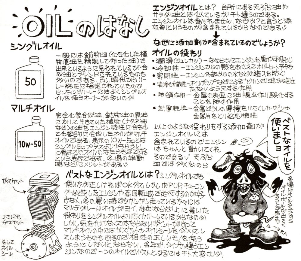 オイルは潤滑油。大小たくさんの金属パーツが猛烈な勢いで擦れ合うエンジンをスムーズに動かすためには欠くことのできない大切なモノじゃ。しっかり学ばんとな!