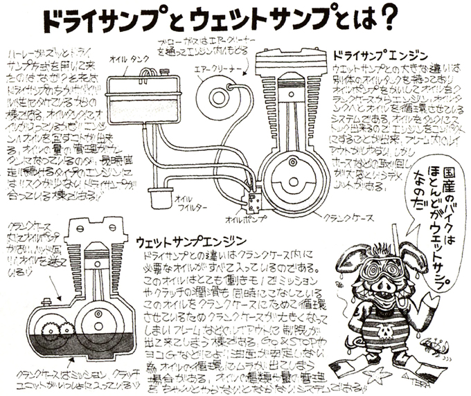 オートバイに限らず、すべてのエンジンにはオイルが入っていることを知らぬ者はおらんじゃろうな。ではオイルが何の役割をしているのか正確に述べることができるかの? エンジンの中でたくさんの金属製パーツがそれこそものすごい勢いで上下に動いたり回ったりしておる。そこでは常に金属同士が触れ合っておるわけで、その摩擦を減らしてスムーズに動かすために必要不可欠なのがオイル。オイルが入っていないエンジンを回せば、ものの数分で焼き付いてしまうじゃろう。図式でも示したとおりエンジン内部にはオイルラインという、生き物の血管のようなオイル経路が巡らしてあり、心臓の役目をするオイルポンプが吐出するオイルがこのラインを通って常にエンジンのすみずみまで行き渡るのである。