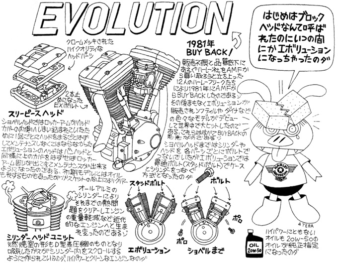 オレにもわかると大評判の「ブタでもわかるハーレーエンスー入門講座」、その第27時間目はエボリューションについてである。1984年にオールアルミのニューエンジンとして登場したエボリューションは、それまでのショベルヘッドの有機的なイメージとはずいぶん異なるスクエアなデザインを採用しておった。ハーレーダビッドソンのOHV・Vツインは1936年のナックルヘッドから始まったわけじゃが、ナックル/パン/ショベルという進化の過程はあくまでも前モデルのイメージを踏襲した上でのニューエンジンという印象が強かったのに対し、エボリューションはショベルまでの古めかしさをみじんも感じさせないモダンなデザインで売り出された。外観だけ でなく乗り味もまたしかり。荒々しい加速フィーリングは角が取れてマイルドとなり、それゆえ発売当初は賛否両論がさかんに飛び交った。「エボ・バッシング」なる現象をも巻き起こしたことは記憶に新しいのう。
