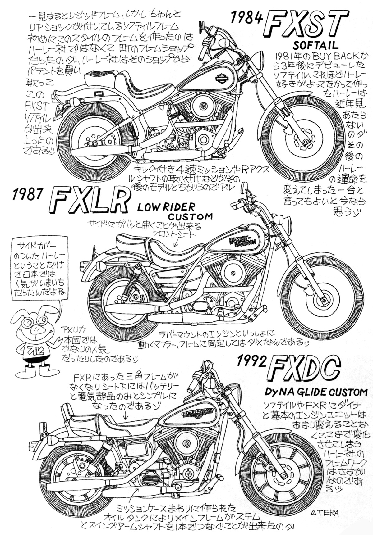 エボリューションのもうひとつの特徴は、ショベル時代の比ではない様々な派生モデルが誕生したことじゃろう。パンヘッド時代まではFL系モデルのみだったビッグツインは、ショベル時代にFX系(スーパーグライドやローライダー、WGなどという名車は今だ根強いファンが多いのう)と FLT系が登場。それがエボリューションになると、リジッドを模したソフテイルやラバーマウントを使用したFXR、その進化型であるダイナグライドといったさまざまなフレームが開発され、それぞれのフレームごとに仕様の異なるモデルがラインナップされたのじゃからな。エンジンの信頼性と高いポテンシャルに豊富なモデル・ラインナップがあいまって、エボリューションは世界各国で大ヒット。ショベル時代に経営危機に貧したハーレーダビッドソン社を見事立ち直らせるまでの人気を獲得したのじゃよ。