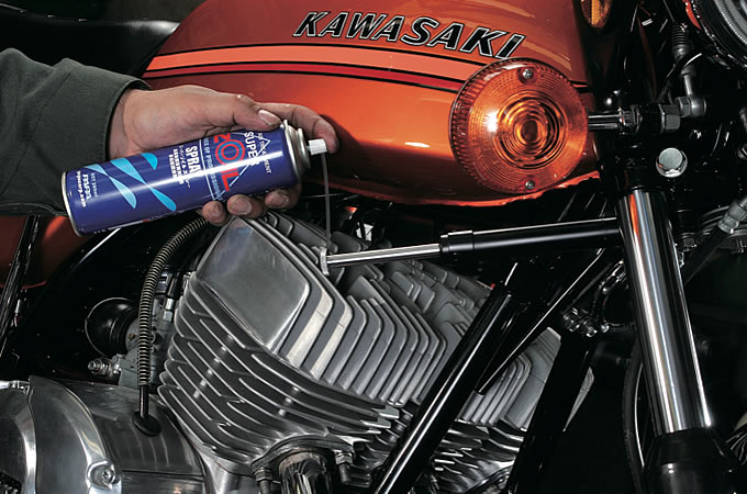 また、耐摩耗性を高めつつ、金属表面をトリートメントすることによって、エンジンオイルに対する負担を減らしている点も見逃せない。金属表面同士が摩擦を繰り返せば当然ながら金属紛が発生し、それが原因でエンジンオイルの汚れが早まってしまう例もある。しかし、金属表面改質効果による滑らか表面の獲得によって、摩擦抵抗が低減。結果的に、エンジンオイルの汚れ速度が低下するというメリットもあるのだ。そんなゾイル効果が認められ、複数のバイクメーカー用品部門では、スーパーゾイルの正規取り扱いを開始している。極めて厳しい検査をクリアできなければ、メーカー推奨用品として認められないのがケミカル商品だ。例えば、塩素系などの有害物質を含有した添加剤は、金属表面を溶かして滑らかにし、短時間で摩擦抵抗を減らせるためレースシーンでは積極的に使われていた時期もあった。しかし、排気ガスとともに有害物質が大気開放されることから、現在では採用例も減ってきているようだ。そんな有害物質を含有した商品が、市販車用推奨ケミカルとしてメーカーに認証されるわけもなく、そのような点でも「ゾイル効果」は確かなものと言えるだろう。そんなスーパーゾイルの金属表面改質成分を含有したケミカル商品が、他にもラインナップされている。スーパーゾイルスプレー、スーパーゾイルチェーンルブ、スーパーゾイルグリースがそれだ。例えば、エンジン組み立て時のアッセンブリーオイルとして利用される機会が多いスーパーゾイルスプレー。この商品は、4サイクルエンジン用スーパーゾイルオイルをスプレー缶に詰めて販売している商品だが、スプレーボトルに充填することで、使い勝手が良いとして好評を得ている。また、焼き付きやダキツキを起こしやすい空冷2サイクルエンジンファンのあいだでは、このスプレーによって出先でのトラブルに対応できたという実例が数多く寄せられているのだ。