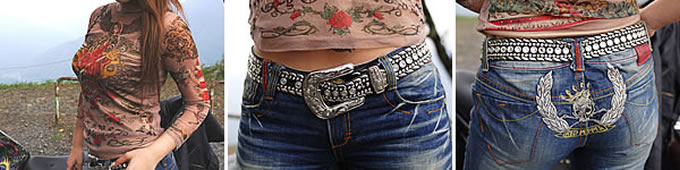 ハードめのダブルのライダースに、インパクトのあるタトゥー・プリントのTシャツが印象的なtoco.さん。その短めの丈にゴツめのベルトで腰まわりが寂しくならずバランスが取れています。コーディネート全体の印象と、オールペイントされたバイクが合っています。バイクとの繋がりを考えてのコーディネートも楽しいものですから。