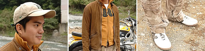 【左】ヘルメットで乱れた髪をカバーするのに欠かせないヘッドウェア。ちなみにヘッドウェアは、その日のコーディネイトで選択できるくらい、形やカラーを数種類持つのが理想。間違ってもバンダナはNGですよ(笑)。 【中央】春・夏・秋とアウターとして着ていたトラックジャケットを、冬の防寒対策としてインナーにコーディネイト。スウェット素材のアイテムは気回しが効くため、ライダー必携です。ただ今回のレイヤードスタイルも悪くないのですが、ブルゾンのファスナー×トラックジャケットのファスナーが煩く少し気になります。インナーはファスナー無しの、プルオーバーの方がスッキリ見えるでしょうね。 【右】清潔感あるホワイトカラー系のスニーカー。足元にも気を遣っているのに好感が持てます。今季はどこか1つ、アウトドアアイテムを取り入れた大人っぽい着こなしが人気ですから、マウンテンブーツを履かれるとさらにオシャレ度がUPしますよ。