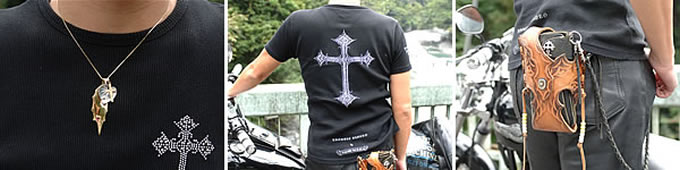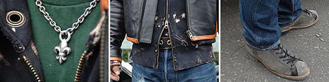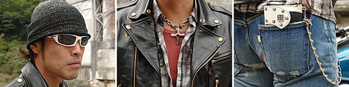 【左】ホワイトカラーのフレームが洒落たサングラス。全身のコーディネイトの中で、いいアクセントになってますね。光の加減で色が変化する調光レンズ使用した物らしいですが、バイク乗りには重宝するサングラスです。私も1点欲しいですよ。ニットCapもイイ感じです。 【中央】ボリュームあるペンダントトップとネックレスのチェーンの太さの絶妙なバランスに注目! アクセサリの使い方は実にいいですね。ただ、インナーのチェックシャツの裾がライダース・ジャケットから出てしまっているのが惜しい。デニムにインした方がスッキリ見えたかもしれませんね。 【右】シルバーアクセサリーショップ「CHAPTER ONE」のオリジナルウォレット&ウォレット・チェーン。ウォレットはエイ皮と牛皮のコンビ、ポケットから見えるアイアンクロス・コンチョの存在感がGOOD。ウォレット・チェーンはシャープなイーグルビーク(鷲のくちばし)がモチーフ。どの角度から見てもスタイリッシュかつ印象的です。まさにファッションコーディネイトのスパイスになるアイテムですね。
