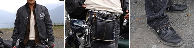【左】アウターが無地でシンプルなため、インナーTシャツはプリントや柄が入った物がいいでしょう。かなり派手な物でもインナーならアクセントになりますから。 【中央】ウエストバッグはバイク乗りにとって、便利なアイテム。各ブランドから数多くリリースされてますので1種類だけ持つのではなく、その日のコーディネイトで色や大きさの異なるバッグを使い分けることをオススメします。 【右】革小物はカラーを合わせるのが基本です。平野さんもウエストバッグとブーツをブラックで合わせているのは○ デニムのレングスもイイ感じです。