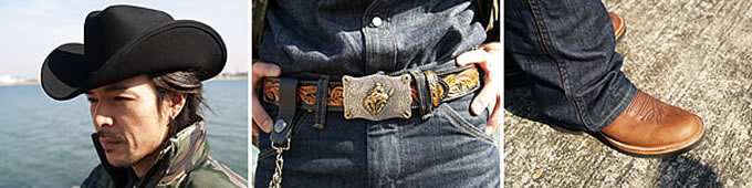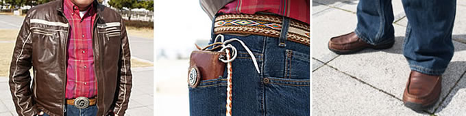 体型に合ったサイジングがお見事ですね。脇役(ヘッドウェアー・ベルト・ブーツなど)である小物アイテムに手を抜かず、主役に代えるお手本的なコーディネイトです。この手のスタイルはついついやりすぎになってしまうことが多いのですが…綺麗にまとまっています。まさに現代版のカウボーイのようなファッションですね。