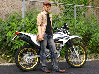 ロングスリーブシャツにブーツカットのジーンズ、ヘッドウェアはハンチングでコーディネイト。全身のサイズ感もバッチリでオシャレにまとまっていますね。1つ惜しいのはインナーのブラックカラーのTシャツが重いこと。ライトカラーをインナーに合わせるとカラーコーデが一段とアップしますよ。バイクとのミスマッチな感じが面白いですね。