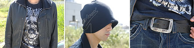 ショート丈のレザージャケットに、インナーはスカルの箔プリントを施したインパクトあるロンTで、コーディネイト。ヘッドウェアにはビーニをセレクトしたおかげか、シンプルだけど全身のアイテムがバランス良く上手くまとまっていますね。ちょっと寂しいのが首元。ストールなどを組み合わせれば、さらにオシャレになっていたと思いますよ。