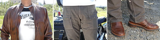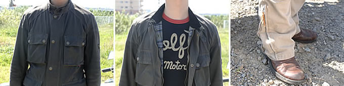 適度に絞ったアームとウエストがシャープな印象のハーフ丈のジャケット。着丈が長いので腰周りまで包み込んで真冬のライディングには重宝しますね。ライダーのハード感が無いので、バイクから降りても街に溶け込めます。ボトムスのカーゴパンツもデザイン・カラーリングと良いセレクトで、ファッションを楽しんでいるのが伝わって来ますよ。