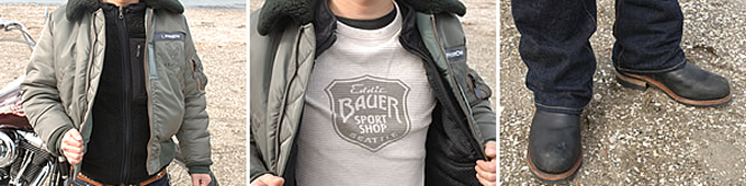 フライトジャケットにインナーは厚地のフリース。インナーはロンTの2枚レイヤードで、ボトムスは濃色のジーンズコーディネイト。フライトジャケットのサイズ感がタイトでイイ感じ。ジーンズ下には電熱タイツを履いてるとのことですが、“モコモコ感”が無くスッキリ見せているのはオシャレを忘れていない証拠。ヘッドウェアが無いのが寂しいなぁ。